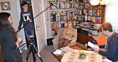Schüler des Ulrichsgymnasiums befragen Stadtchronistin Elfriede Rottmann für eine Dokumentation.