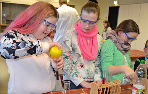 Eine Gruppe von Schülerinnen versucht im Chemieraum herauszufinden, wie sich bestimmte Haushaltsmittel auf die Farbe von Rotkohlsaft auswirken und sind erstaunt, als sich der Saft von lila nach rot verfärbt, wenn er mit Essig oder Zitronensaft in Berührung kommt. Im Biologieraum geben Schüler und Lehrer des UGN einen Überblick über Pflanzen, Tiere und Menschen.
