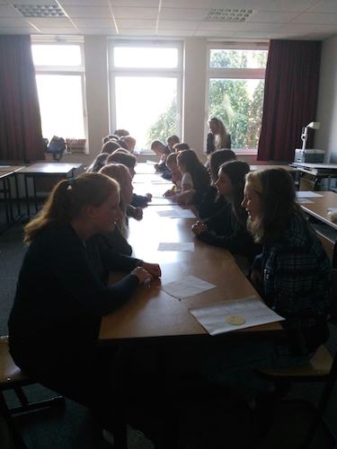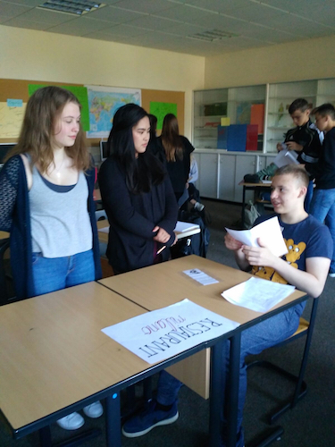 Die Schüler des Grundkurses 11 Französisch hatten für die Minsker Jugendlichen ein „Sprachendorf“ vorbereitet. Die weißrussischen Schüler durften an verschiedenen Stationen wie z. B. „im Restaurant“, „in der Touristeninformation“ oder „im Schuhgeschäft“ ihre deutschen Sprachkenntnisse erproben. Unseren Gästen fiel es am Anfang sehr schwer, ihre Schüchternheit zu überwinden, aber die deutschen Schüler, die die verschiedenen Stände besetzt hatten, reagierten sehr einfühlsam und kompetent darauf und nach kurzer Zeit gelang es, alle ins Gespräch zu ziehen. Ein großes Lob an den wunderbaren Französischkurs!