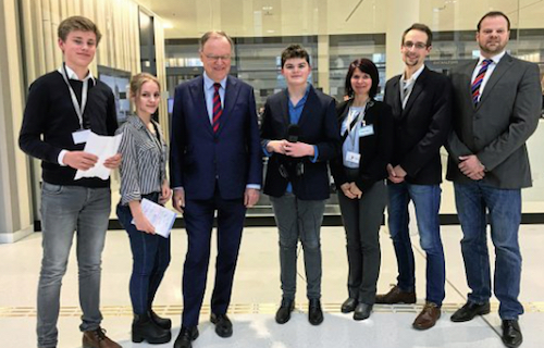 Seit Mittwoch sind Leonie Brose (15), Lea-Luise Knöchel (17), Keno Kersten (15) und Fabian Schröder (15) zu Gast im Landtag, um über ausgewählte Politikdebatten zu berichten (wir berichteten). Die Nachwuchsjournalisten hatten sogar Gelegenheit, Ministerpräsident Stephan Weil zu interviewen. Das Foto zeigt Keno Kersten (v.l.), Lea-Luise Knöchel, Stephan Weil, Fabian Schröder, n-21-Projektleiterin Natalie Deseke, Lehrkraft Silas Lippert und den SPD-Landtagsabgeordneten Matthias Arends als Paten des Projekts.
