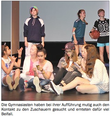 In insgesamt drei Aufführungen, unter anderem vor den kompletten 5. und 6. Jahrgängen des UGN, setzten die Spieler mutig auf den Kontakt mit ihrem Publikum. So hatten sie den Schluss bewusst offen und ohne plattes Happy End angelegt, um im anschließenden Austausch mit den Zuschauern von der Bühne aus gemeinsam nach Lösungen für Liebeskummer, Probleme und alltäglichen Ärger zu suchen.