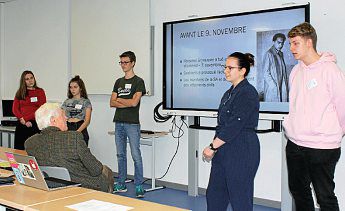 Mit Anne-Marie Poutiers ist auch die Vorsitzende des „Relais de la Mémoire Juniors“ nach Norden gereist. Sie verwies wie auch im Anschluss die Relais-Schülergruppe des UGN auf den bevorstehenden schicksalsträchtigen Sonnabend: den 9. November. Brennende Synagogen 1938, der Fall der Mauer 1989. Aber schon zuvor, das erläuterten die Norder Schüler und Schülerinnen, habe es geschichtsträchtige Ereignisse an eben diesem Tag gegeben, beispielsweise 1848 (Hinrichtung Robert Blum, Kehrtwende Revolution), 1918 (Novemberrevolution) und 1923 („Hitlerputsch“).