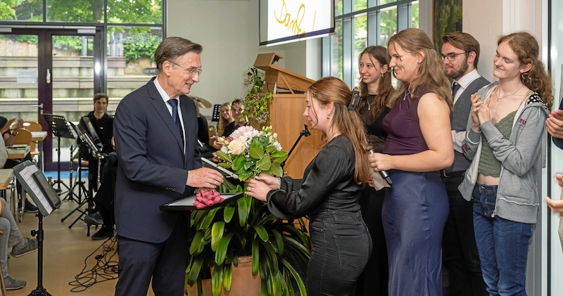 Was die Schülerinnen und Schüler an Wolfgang Grätz wertschätzten, zeigte unter anderem ein Video-Einspieler, den die Schülervertreter Edda Mellies, Tjarko de Vries und Ida de Vries vorbereitet hatten. Sie hatten Mitschülerinnen und -schüler verschiedener Jahrgangsstufen interviewt. Sie beschrieben ihren Schulleiter als „cool“, „supi“ und einfach „gut“. Er habe progressive Ideen gefördert, seine Schüler ernst genommen. „Bei ihn sind wir uns nie kindlich oder dumm vorgekommen.“ Ein Ulrichsgymnasium ohne ihn sei nur schwer vorstellbar.