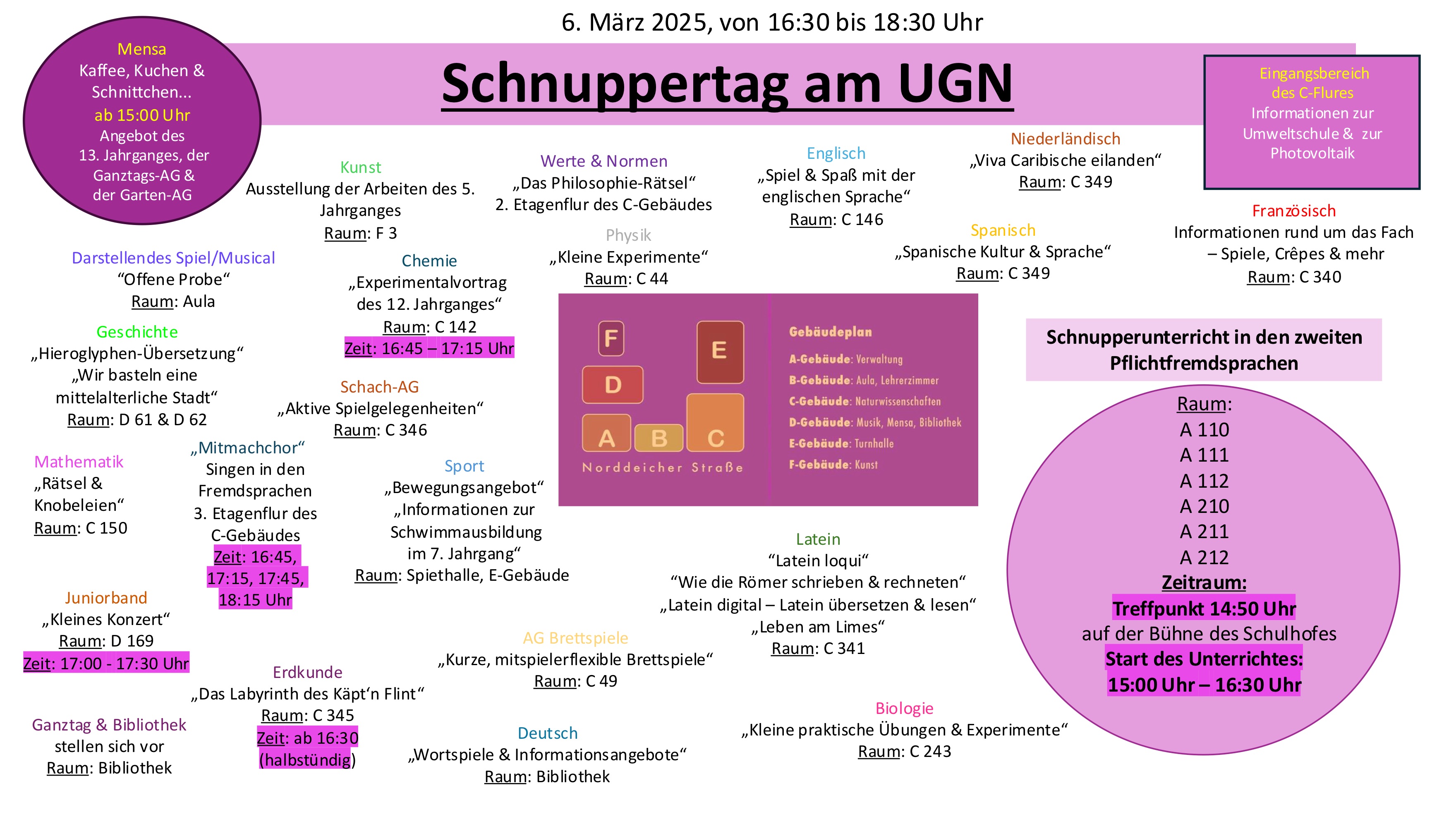 16:30-18:30 Uhr: Möglichkeit zum gemeinsamen Besuch weiterer, vielfältiger Angebote der am UGN unterrichteten Fächer und AG-Angebote. Das Programm ist ab dem 04.03.2025 hier online einsehbar! |
