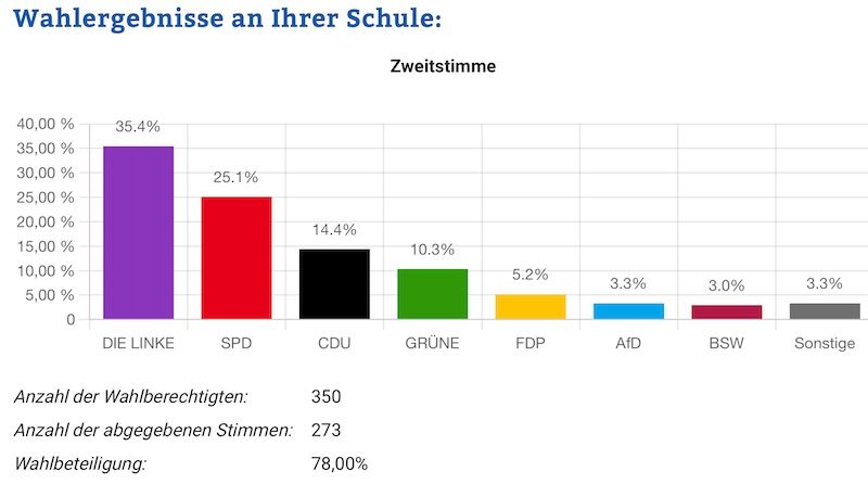 Die 270 Wählenden gaben dabei insgesamt deutlich den progressiveren Parteien den Vorzug. Zugleich entspricht diese Tendenz dem gesamtdeutschen Juniorwahlergebnis. Auch die in Teilen rechtsextreme AfD spielte am UGN nur eine Nebenrolle.