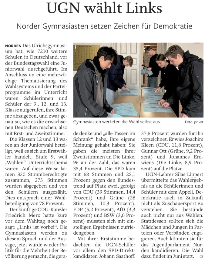 Die Jahrgänge 9, 12 und 13 nahmen an der Juniorwahl am UGN teil und sorgten für ein Ergebnis, das deutlich vom Ergebnis der wählenden Gesamtbevölkerung abweicht.