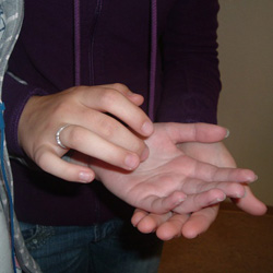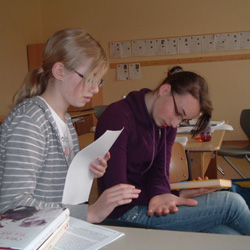 Wir haben als erstes über die Einrichtung (TBZ Taubblinden-Zentrum in Hannover) geredet, die wir am Donnerstag besuchen wollten. Dann beschäftigten wir uns mit der Gebärdensprache und der Blindenschrift. Mit Hilfe von Arbeitsblättern zum Gebärden und Lormen (Tastalphabet) konnten wir selbst üben. Anschließend spielten wir „Lormpost“. Es geht so wie Flüsterpost, nur dass man hier das Lormen benutzt und dass man nur das letzte Wort laut sagen darf. Acu unterhielten wir uns in Kleingruppen „lormend“. Mit Schals vor den Augen und Kopfhörern versuchten wir auch uns „blind und „taub“ zu unterhalten.
