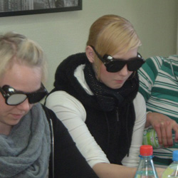 Bei der Ankunft im TBZ wurden wir von zwei Betreuern empfangen und in de zweiten Stock geleitet. Auf dem Weg dorthin konnten wir schon überall die speziellen Einrichtungen für die Taubblinden sehen. Es gibt dort vieles zum Tasten. Wir durften dann erst mal frühstücken, aber – Stopp - nicht ganz so einfach, wir bekamen verschiedene Brillen, wodurch man wie die Sehbehinderten bzw. Blinden „sehen“ konnte. Da gab es eine Art Schlafbrille, durch die man gar nichts sehen konnte. Dann gab es welche mit einem winzigen Loch in der Mitte oder auch umgekehrt, so dass man alles sah bis auf den schwarzen Punkt in der Mitte. Dann gab es milchige Brillen, durch die man alles total verschwommen sah. Wir bekamen erklärt, wie man sich etwas in ein Glas einschenkt, nämlich indem man einen Finger in das Glas hält und wartet, bis das Getränk die Fingerkuppe erreicht hat. Ansonsten gab es noch zu beachten, dass alles, z.B. die Butter, wieder an den ursprünglichen Platz zurückgestellt wurde, dass der Nächste die Butter auch wieder fand. Wir versuchten zu essen. Bei manchen endete das in einer kleinen „Schweinerei".