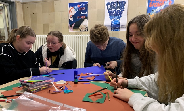 Kreativität fand ihren Ausdruck in angebotenen selbstgebastelten Grußkarten und weihnachtlicher Dekoration, Flohmarktständen und den Basteltischen, an denen Besucher Baumschmuck und zierende Ringe selbst herstellen konnten. Der Schülerratsvorstand rettete einige alte Abijahrbücher vor der Vernichtung und sorgte dabei für nostalgische Gefühle bei einigen - „Schau mal, wie klein die Kinder da noch waren.“ Für Stimmung sorgte auch die Klasse 6d, begleitet von Jochen Fischer, mit Weihnachtsliedern, zu denen einige der Besucher sich dann auch mitzusingen trauten. Die spürbare Verbundenheit und gute Stimmung untereinander war somit ein weiteres Reallabor der Nachhaltigkeit, nicht nur im sozialen Sinne, sondern auch durch die Erkenntnis, wie mit einfachen Mitteln und ohne Konsumstress eine attraktive und hinsichtlich der Preise gut leistbare Veranstaltung ablaufen kann.