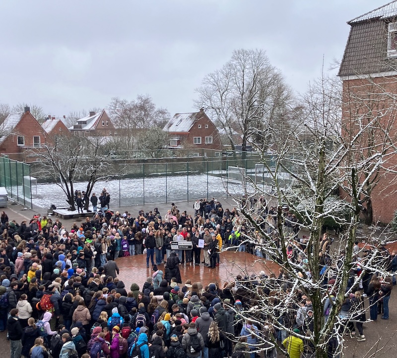 Alle Beiträge griffen das Thema des Tages auf – von der Europa-Hymne Ode an die Freude über Udo Jürgens’ Komm, wir ziehen in den Frieden bis hin zum selbstgeschriebenen Lied der Demokratie-AG Du bist nicht allein, mit dem die Schule 2022 den 2. Platz beim niedersächsischen Schülerfriedenspreis erreichte. Die Beiträge waren im Rahmen des Demokratie-Projekttags am 28. Januar entstanden, an dem sich alle Klassen einen Vormittag lang mit Themen wie Demokratie, Menschenrechten und Rassismus auseinandergesetzt hatten.