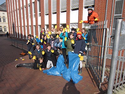 Wie in jedem Jahr beteiligte sich das Ulrichsgymnasium wieder mit mehreren Klassen an der Müllsammelaktion der Stadt Norden. Ausgestattet mit leuchtend gelben Handschuhen und Müllsäcken ging es hochmotiviert dem Unrat in den Straßen rund um das Ulrichsgymnasium zu Leibe.